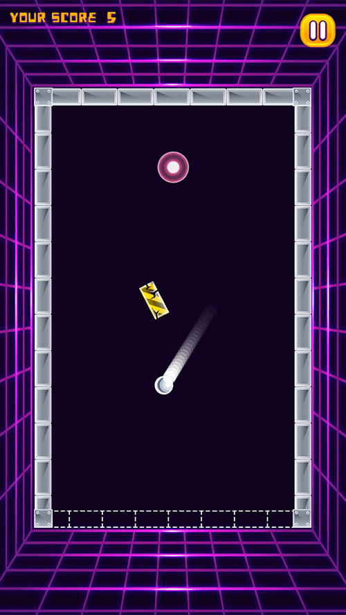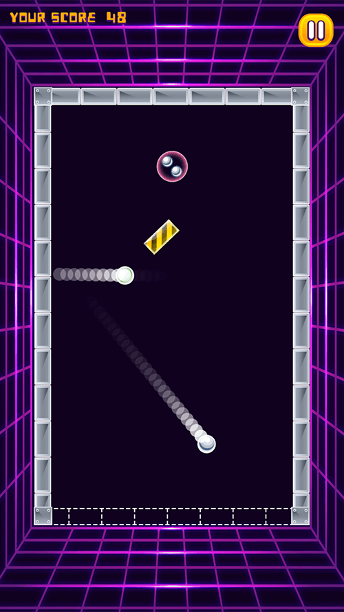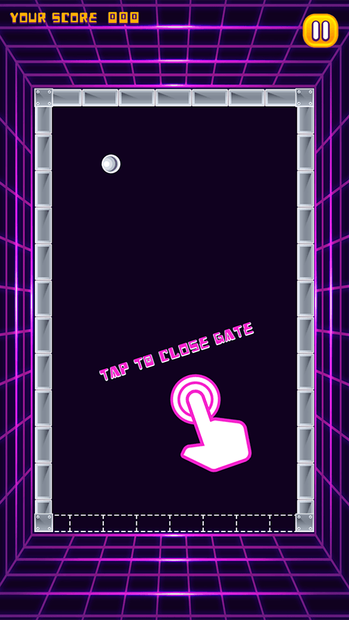 Tap the screen to close the gate near the bottom of the screen and keep the ball confined within the walls. You can influence the angle of departure by the timing of your gate close. The game is over when the ball escapes the walls, provided there are no active power-ups.